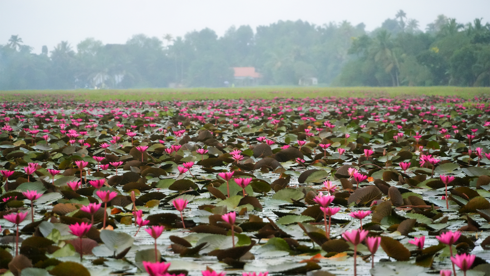 When the water blooms, Malarickal turns into a sea of pink. Lotus flowers spread across the backwaters, reflecting the soft morning light. Boats move gently through the blooms, birds skim the surface, and the village wakes up slowly around the water.